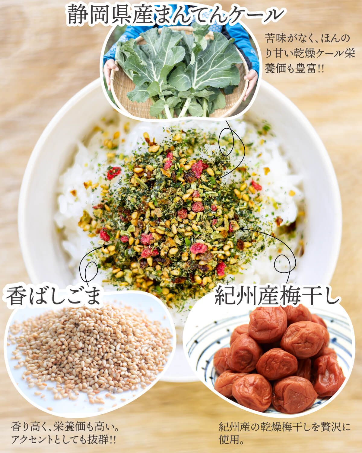 ●原材料:乾燥ケール(静岡県産)、味付ごま(ごま、歯油、ぶどう糖、食塩、酵母エキス)、味付かっお(かつお削りぶし、醤油、砂糖、ぶどう糖、グラニュー糖、食塩、酵母エキス)、梅肉ペースト(梅肉、しそ液、梅酢、食塩、乳糖)、青のり粉、(一部に乳成分・小麦・大豆・ごまを含む)