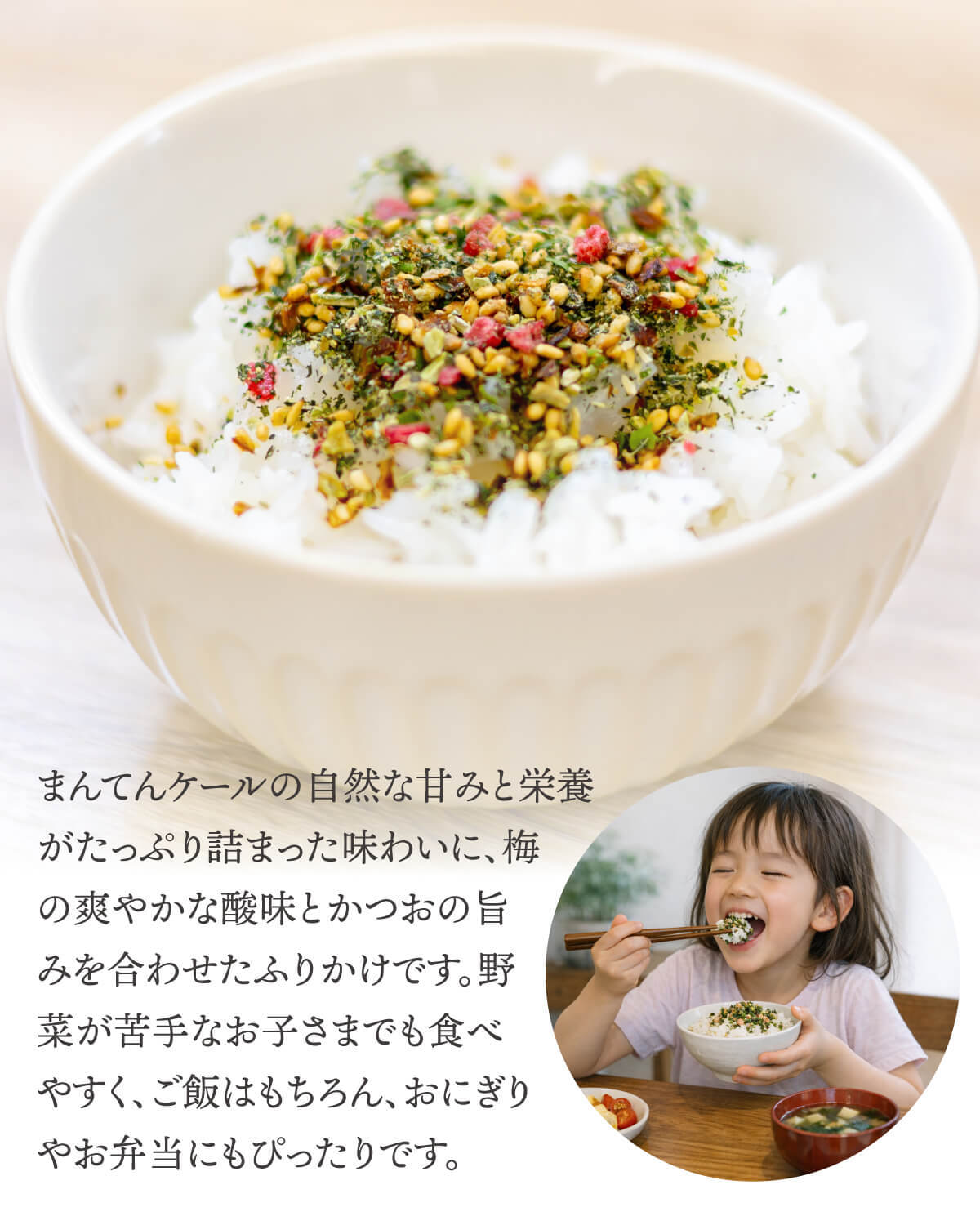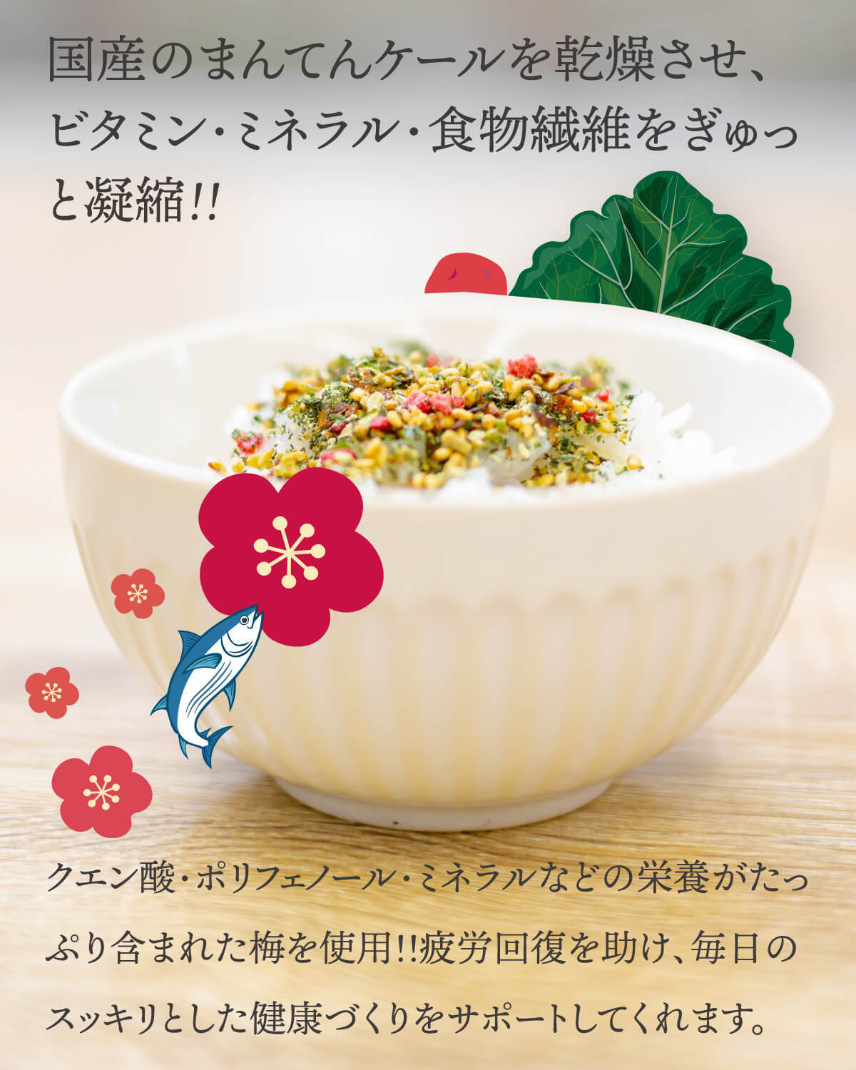 まんてんケールを乾燥させ、栄養素をそのまま活かしチップに仕上げ、紀州産梅の豊かな風味と爽やかな酸味を贅沢に合わせた、風味豊かなふりかけです。ケールのビタミンや食物繊維、梅のクエン酸やポリフェノールを一度に摂れる栄養バランスに優れた一品。添加物を一切使用せず、自然の恵みだけで仕上げているので安心してお召し上がりいただけます。